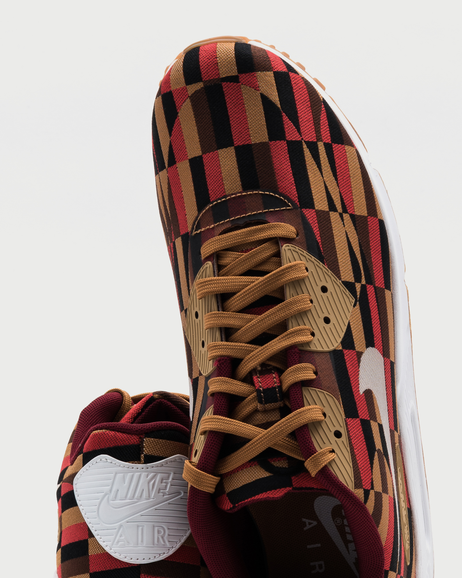 The Nike Air Max 90 London Underground has an engineered one-piece poly weave upper made using the rigorous, age-old process of loomed Jacquard material. With contours characterized by pattern breaks that emulate the panels created by conventional construction, the shoe’s signature Swoosh and eye-row overlay panels are applied with a no-sew technique that uses heat and pressure for adhesion.