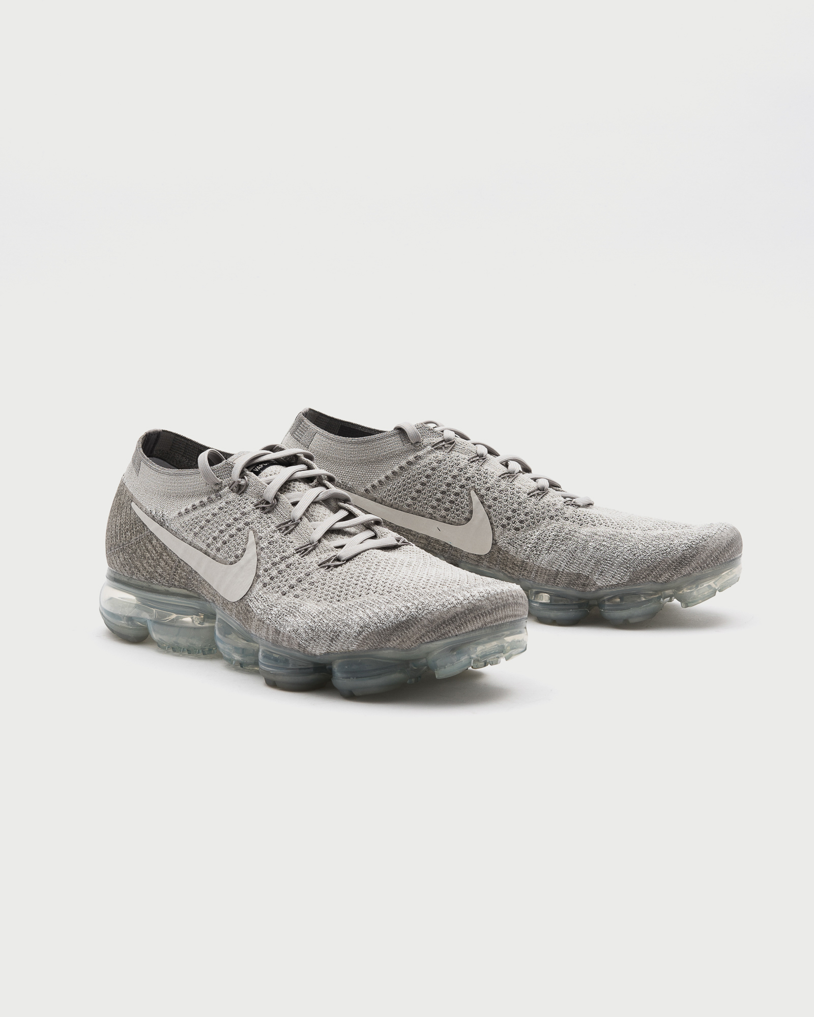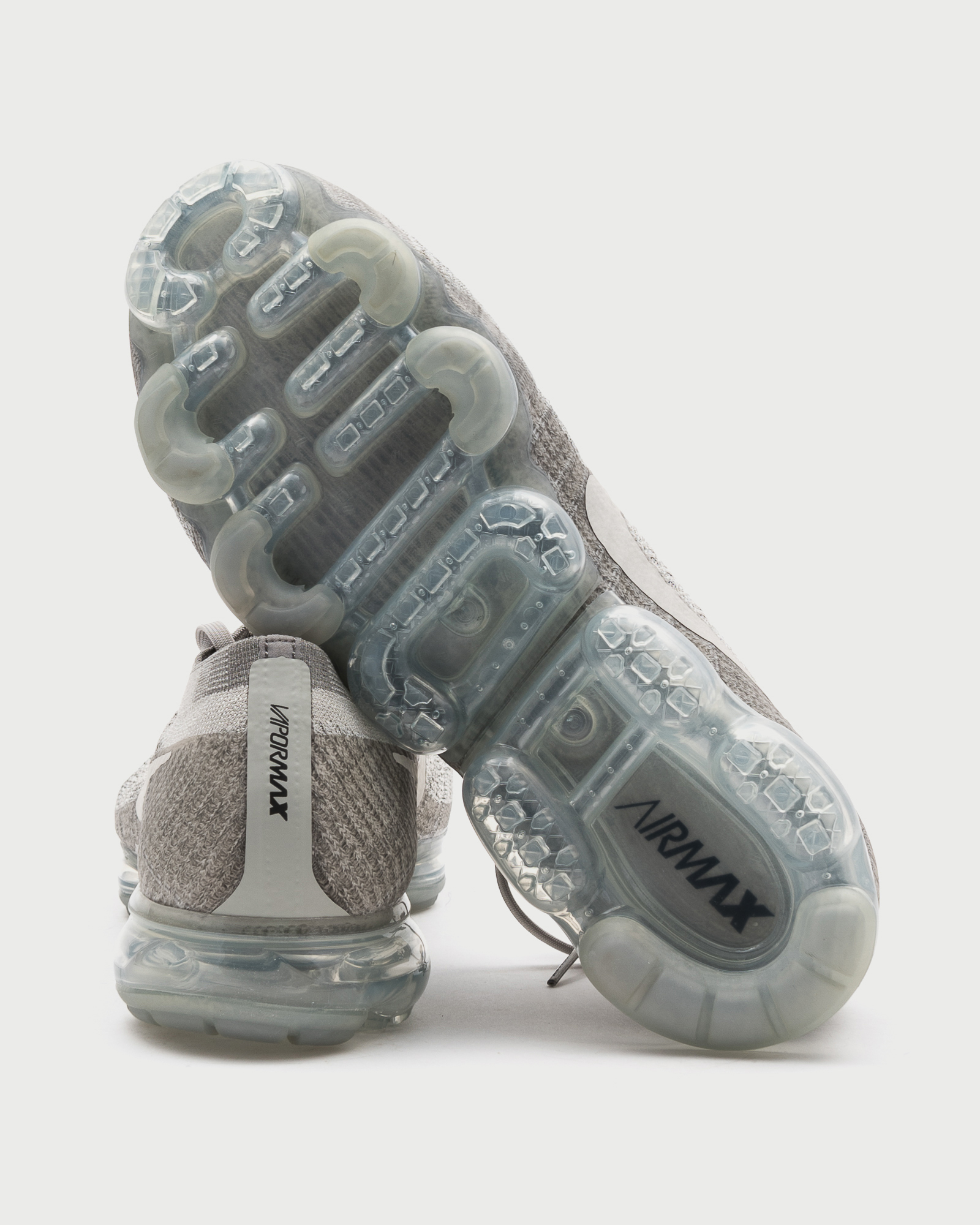 The pale grey colorway of the Air VaporMax showcases a predominantly light grey Flyknit upper, complemented by darker grey accents. Its standout feature is the translucent VaporMax Air sole unit that runs the entire length of the shoe, providing remarkable cushioning, responsiveness, and flexibility.