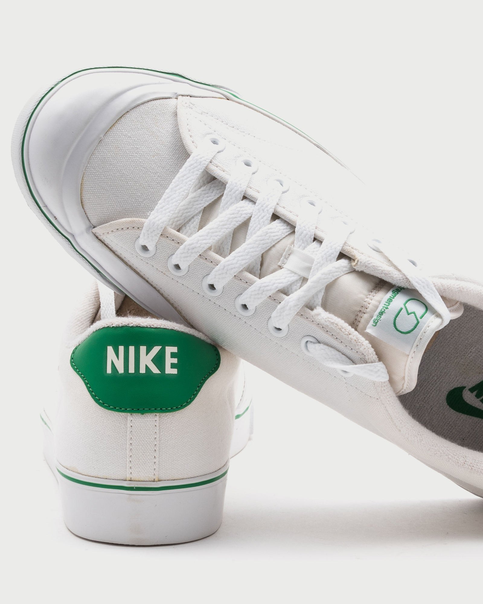 The sneaker features the Fragment Design logo on the tongue and some lucky green details on both upper and midsole, as well as a classic white rubber sole